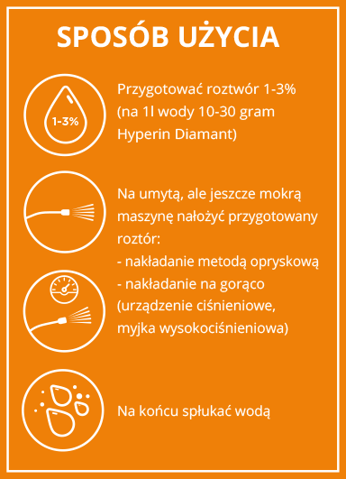 Najlepszym sposobem nakładania hydro wosku Hyperin Diamant jest opryskiwacz ciśnieniowy. Za jego pomocą nakładamy ciecz roboczą na powierzchnię jeszcze mokrej maszyny rolniczej, od razu po myciu. Po nałożeniu hydro wosku od razu spłukujemy